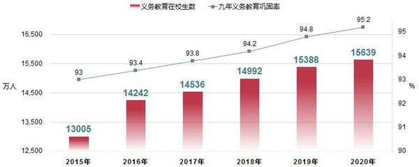 2020年,全国共有义务教育阶段学校21.08万所。招生3440.19万人,在校生1.56亿人。专任教师1029.49万人。九年义务教育巩固率95.2%。