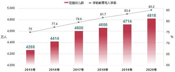 2020年,全国共有幼儿园29.17万所。入园儿童1791.40万人,在园幼儿4818.26万人。其中,普惠性幼儿园在园幼儿4082.83万人,普惠性幼儿园覆盖率达到84.74%。幼儿园共有专任教师291.34万人。学前教育毛入学率85.2%。
