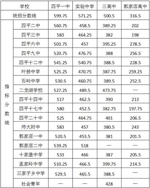 四平市第一高级中学、四平市实验中学、四平市第三高级中学、郭家店高级中学的指标生录取最低分数控制线分别在该校统招生录取分数线向下降低120分。在此分值区间内,以初中学校为单位,按各校指标生数从高到低,依次录取。